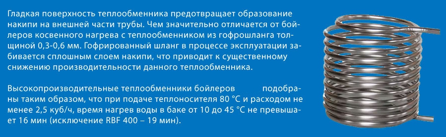 Внутри бойлера RBW установлен один теплообменник. Теплообменник выполнен из трубы, изготовленной из нержавеющей стали AISI 304, с наружным диаметром 32 мм. Теплообменник бойлера косвенного нагрева подключается к системе отопления. Нагретый теплоноситель, двигаясь по теплообменнику, нагревает воду для хозяйственных нужд. Конструкция теплообменников гарантирует высокую производительность оборудования и быстрый нагрев воды системы ГВС, отвечающей всем санитарным нормам.